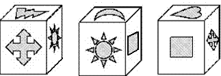 En las tres fotos de un mismo cubo aparecen los dibujos de sus caras. Relaciona la imagen que se encuentra en el lado opuesto de la cara mencionada.